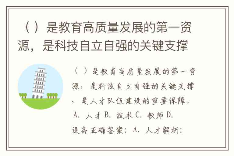( )是教育高质量发展的第一资源,是科技自立自强的关键支撑,是人才队伍建设的重要保障。 A. 人才 B. 技术 C. 教师 D. 设备