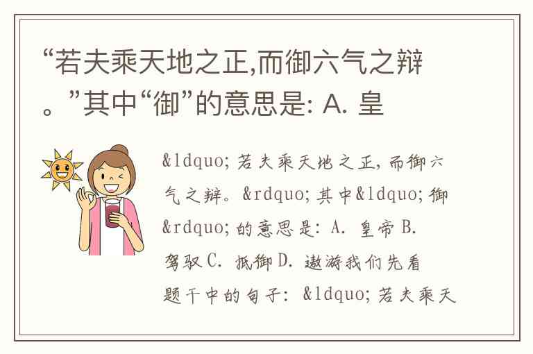 “若夫乘天地之正,而御六气之辩。”其中“御”的意思是: A. 皇帝 B. 驾驭 C. 抵御 D. 遨游