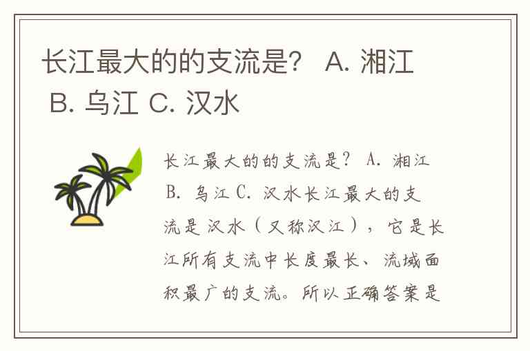 长江最大的的支流是? A. 湘江 B. 乌江 C. 汉水