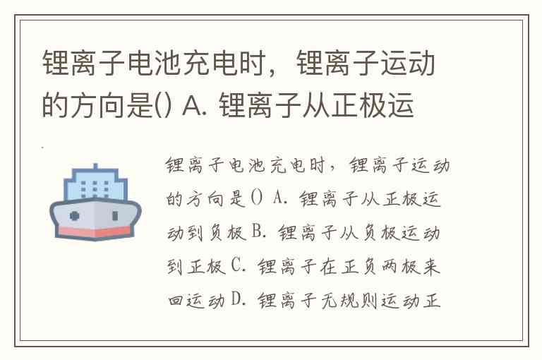 锂离子电池充电时,锂离子运动的方向是() A. 锂离子从正极运动到负极 B. 锂离子从负极运动到正极 C. 锂离子在正负两极来回运动 D. 锂离子无规则运动