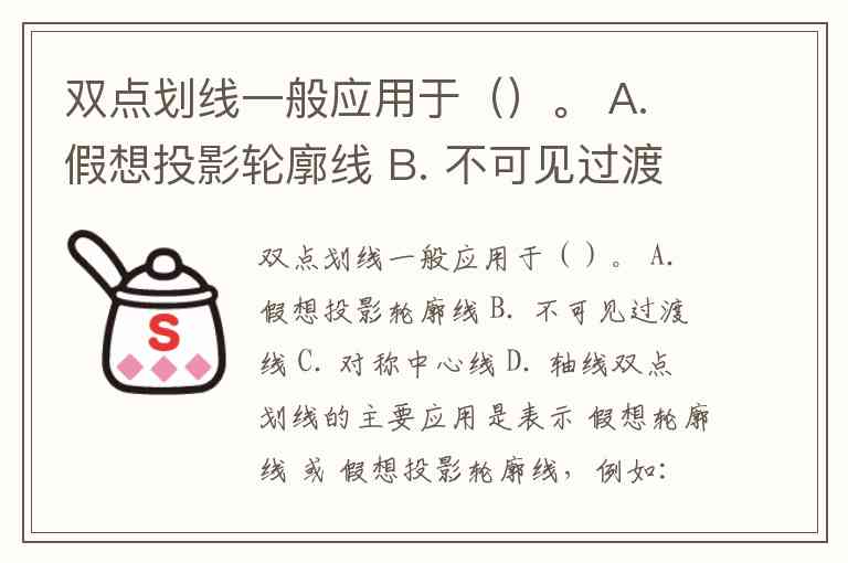 双点划线一般应用于()。 A. 假想投影轮廓线 B. 不可见过渡线 C. 对称中心线 D. 轴线