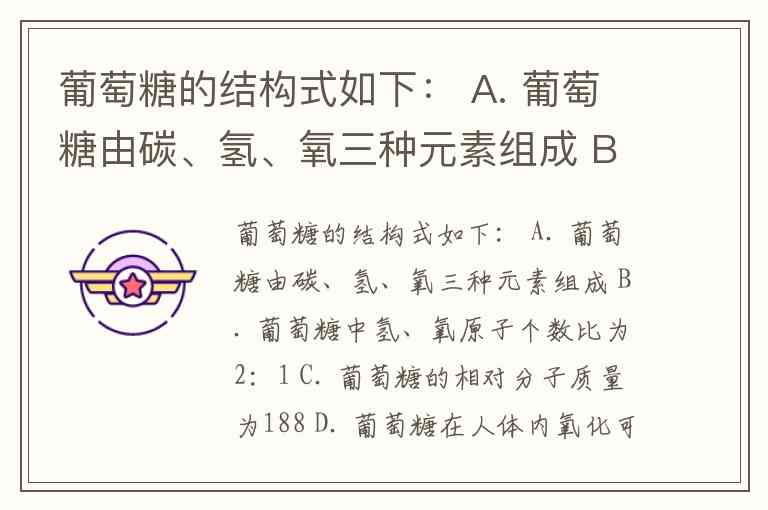 葡萄糖的结构式如下: A. 葡萄糖由碳、氢、氧三种元素组成 B. 葡萄糖中氢、氧原子个数比为2:1 C. 葡萄糖的相对分子质量为188 D. 葡萄糖在人体内氧化可提供能量