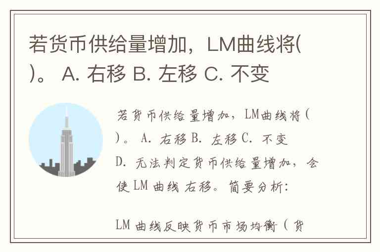 若货币供给量增加,LM曲线将( )。 A. 右移 B. 左移 C. 不变 D. 无法判定