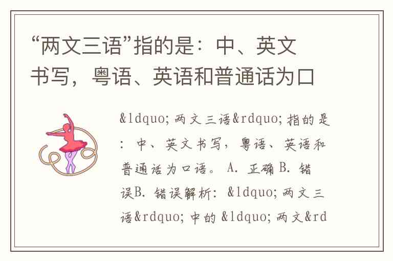 解析:“两文三语”中的 “两文” 是指中文和英文的书面语,“三语”是指粤语、英语和普通话的口语。题目中写“中、英文书写”是正确的,但“粤语、英语和普通话为口语”的部分表述容易引起误解,因为“三语”指的是口语,但普通话和粤语都属于汉语口语变体。不过从定义上来说,题目整体表述接近常见解释,但严格来说表述不够准确。
