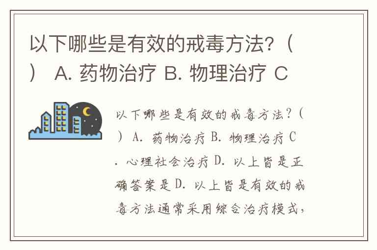 以下哪些是有效的戒毒方法?( ) A. 药物治疗 B. 物理治疗 C. 心理社会治疗 D. 以上皆是