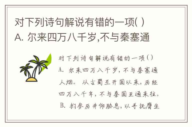对下列诗句解说有错的一项( ) A. 尔来四万八千岁,不与秦塞通人烟。 从古蜀王开国以来,历经四万八千年,不与秦国互通来往。 B. 扪参历井仰胁息,以手抚膺坐长叹。 手可摸到参星,穿过井星,仰起头屏住呼吸;手抚胸口,坐地长叹。 C. 飞湍瀑流争喧豗,砯崖转石万壑雷。 飞奔而下的急流瀑布交相喧闹,水冲击山崖,碎石滚滚而下,山谷中响起雷鸣般的声音。 D. 所守或匪亲,化为狼与豺。 所守护的人不是匪徒就是亲戚,但是转眼就可能变作豺狼一样的人。 A. 从古蜀王开国以来,历经四万八千年,不与秦国互通来往。 B. 手可摸到参星,穿过井星,仰起头屏住呼吸;手抚胸口,坐地长叹。 C. 飞奔而下的急流瀑布交相喧闹,水冲击山崖,碎石滚滚而下,山谷中响起雷鸣般的声音。 D. 所守护的人倘若不是亲信,一旦叛变,就会发生像豺狼吃人那样的祸患。