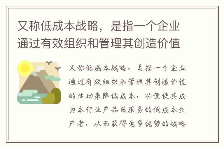 又称低成本战略,是指一个企业通过有效组织和管理其创造价值的活动来降低成本,以便使其成为本行业产品或服务的低成本生产者,从而获得竞争优势的战略。 A. 差异化战略 B. 成本差异化战略 C. 集中化战略 D. 成本领先战略