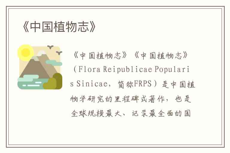 《中国植物志》(Flora Reipublicae Popularis Sinicae,简称FRPS)是中国植物学研究的里程碑式著作,也是全球规模最大、记录最全面的国家级植物志之一。以下是对它的系统介绍: