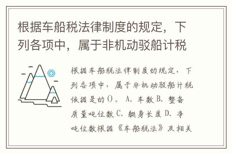根据车船税法律制度的规定,下列各项中,属于非机动驳船计税依据是的()。 A. 车数 B. 整备质量吨位数 C. 艇身长度 D. 净吨位数
