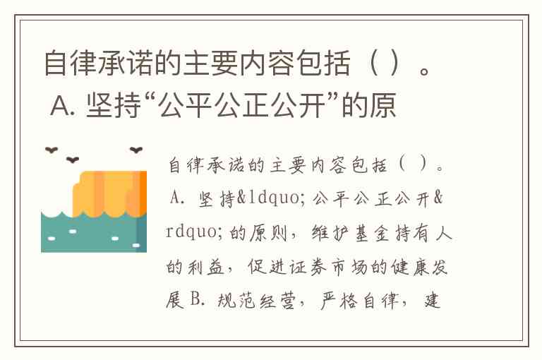 自律承诺的主要内容包括( )。 A. 坚持“公平公正公开”的原则,维护基金持有人的利益,促进证券市场的健康发展 B. 规范经营,严格自律,建立完善内部管理制度和风险控制制度 C. 加强与境外基金管理公司托管银行以及境内成员的交流和沟通,提高基金管理水平和托管水平 D. 加强基金的宣传及投资者教育,共同培育投资基金市场