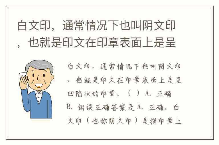 白文印,通常情况下也叫阴文印,也就是印文在印章表面上是呈凹陷状的印章。( ) A. 正确 B. 错误