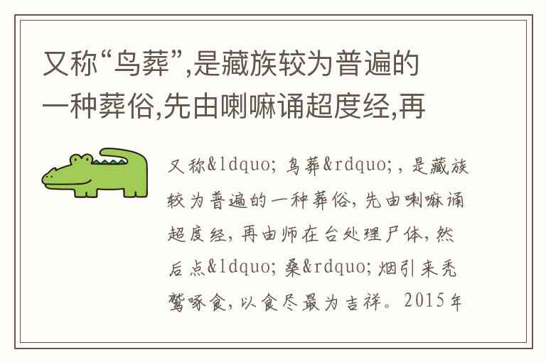 又称“鸟葬”,是藏族较为普遍的一种葬俗,先由喇嘛诵超度经,再由师在台处理尸体,然后点“桑”烟引来秃鹫啄食,以食尽最为吉祥。2015年审议通过了《管理条例》来保护这一拥有上千年历史的丧葬习俗。尊重和保护藏族同胞独特葬俗的文化意义是( )①保护民族的文化基因和精神生活②重视传统习俗对人们的精神生活的持久影响③文化在继承的基础上发展,在发展的过程中继承④有利于把落后文化从传统习俗中剥离出来 A. ①② B. ①④ C. ②③ D. ③④