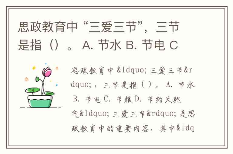 思政教育中 “三爱三节”,三节是指()。 A. 节水 B. 节电 C. 节粮 D. 节约天然气