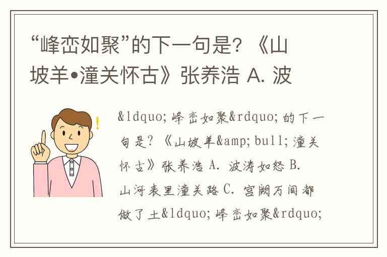 “峰峦如聚”的下一句是? 《山坡羊•潼关怀古》张养浩 A. 波涛如怒 B. 山河表里潼关路 C. 宫阙万间都做了土