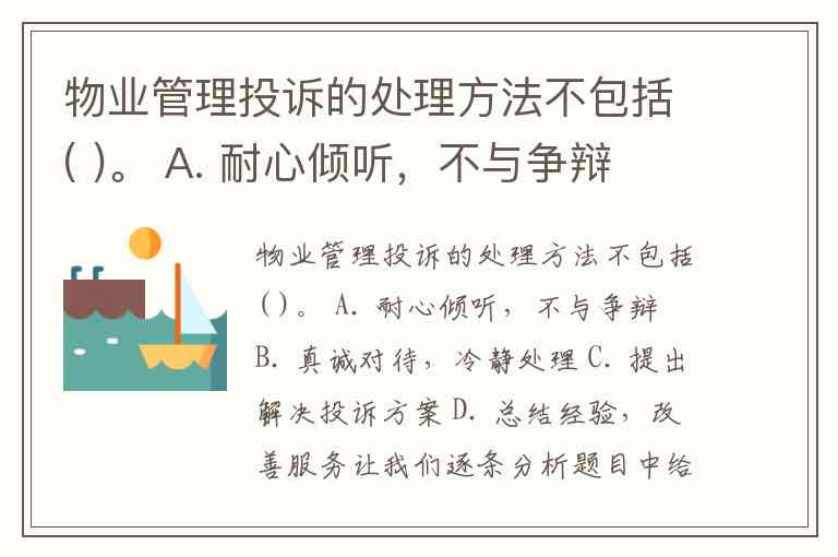 物业管理投诉的处理方法不包括( )。 A. 耐心倾听,不与争辩 B. 真诚对待,冷静处理 C. 提出解决投诉方案 D. 总结经验,改善服务