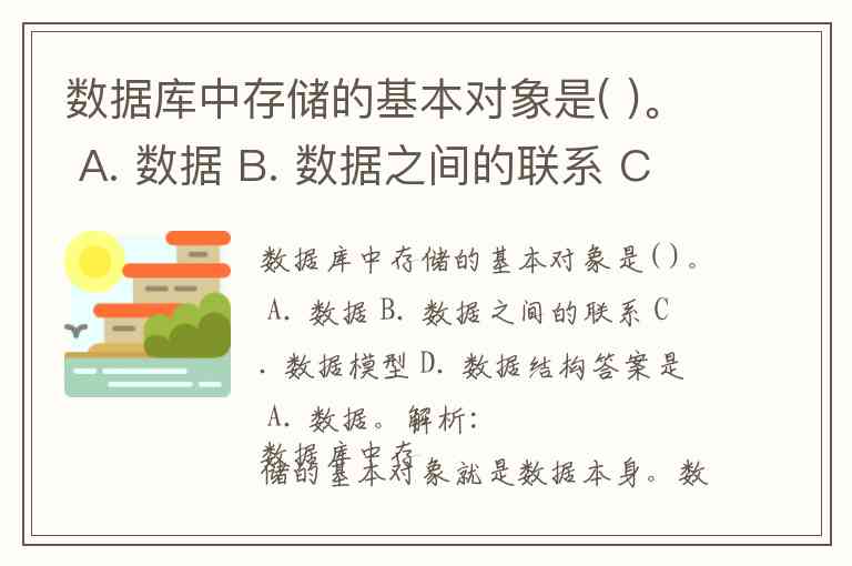 解析:数据库中存储的基本对象就是数据本身。数据经过组织和描述后存储在数据库中,而数据之间的联系、数据模型和数据结构都是用来描述、组织和操作这些数据的工具或方式,并不是直接存储的基本对象。
