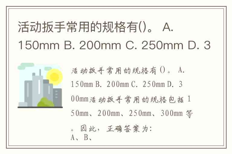 活动扳手常用的规格有()。 A. 150mm B. 200mm C. 250mm D. 300mm