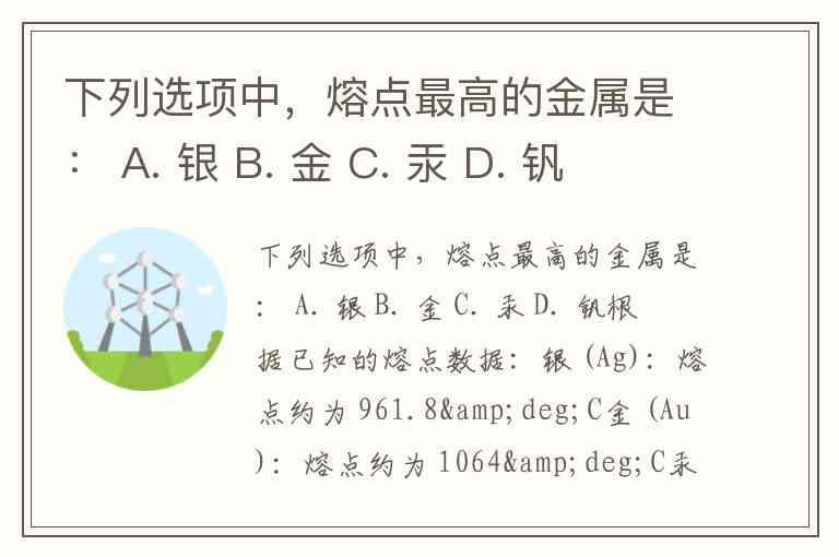 下列选项中,熔点最高的金属是: A. 银 B. 金 C. 汞 D. 钒