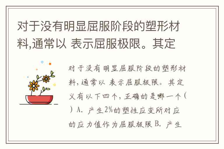 对于没有明显屈服阶段的塑形材料,通常以 表示屈服极限。其定义有以下四个,正确的是哪一个( ) A. 产生2%的塑性应变所对应的应力值作为屈服极限 B. 产生0.02%的塑性应变所对应的应力值作为屈服极限 C. 产生0.2%的塑性应变所对应的应力值作为屈服极限 D. 产生0.2%的应变所对应的应力值作为屈服极限