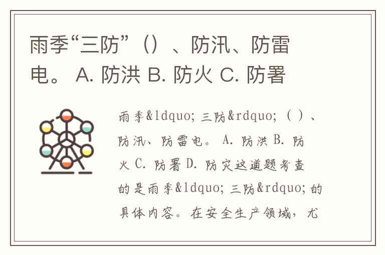 在安全生产领域,尤其是煤矿、建筑等行业,雨季“三防”通常指的是 防洪、防汛、防雷电。其中“防洪”与“防汛”字面意思相近,但实际管理中常同时强调。从常见表述来看,雨季“三防”标准的答案一般是 防洪、防排水、防雷电 或 防洪、防汛、防雷电。