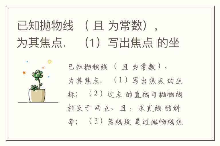 已知抛物线 ( 且 为常数), 为其焦点. (1)写出焦点 的坐标; (2)过点 的直线与抛物线相交于 两点,且 ,求直线 的斜率; (3)若线段 是过抛物线焦点 的两条动弦,且满足 ,如图所示.求四边形 面积的最小值 .