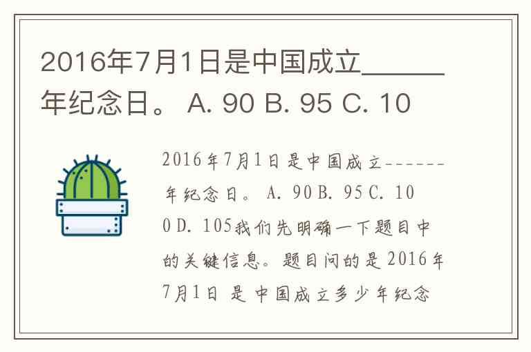 2016年7月1日是中国成立______年纪念日。 A. 90 B. 95 C. 100 D. 105