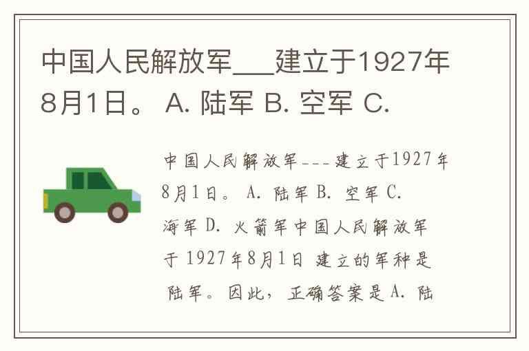 中国人民解放军___建立于1927年8月1日。 A. 陆军 B. 空军 C. 海军 D. 火箭军