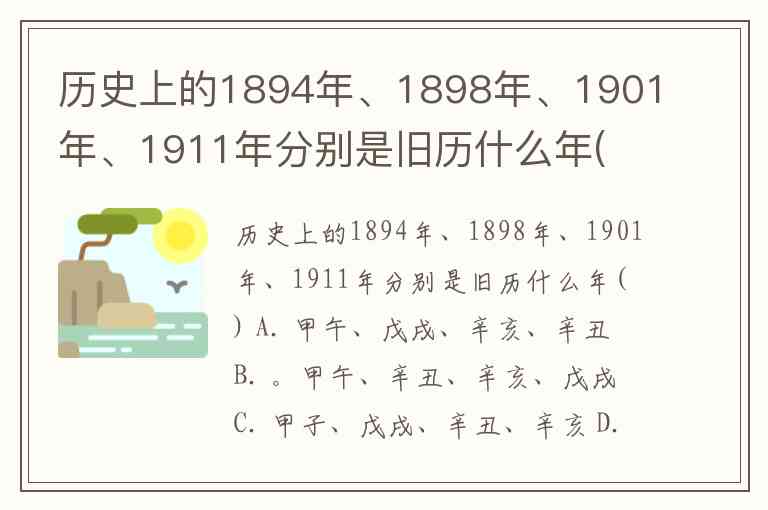 历史上的1894年、1898年、1901年、1911年分别是旧历什么年( ) A. 甲午、戊戌、辛亥、辛丑 B. 。甲午、辛丑、辛亥、戊戌 C. 甲子、戊戌、辛丑、辛亥 D. 。甲午、戊戌、辛丑、辛亥