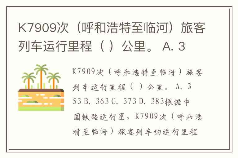K7909次(呼和浩特至临河)旅客列车运行里程( )公里。 A. 353 B. 363 C. 373 D. 383