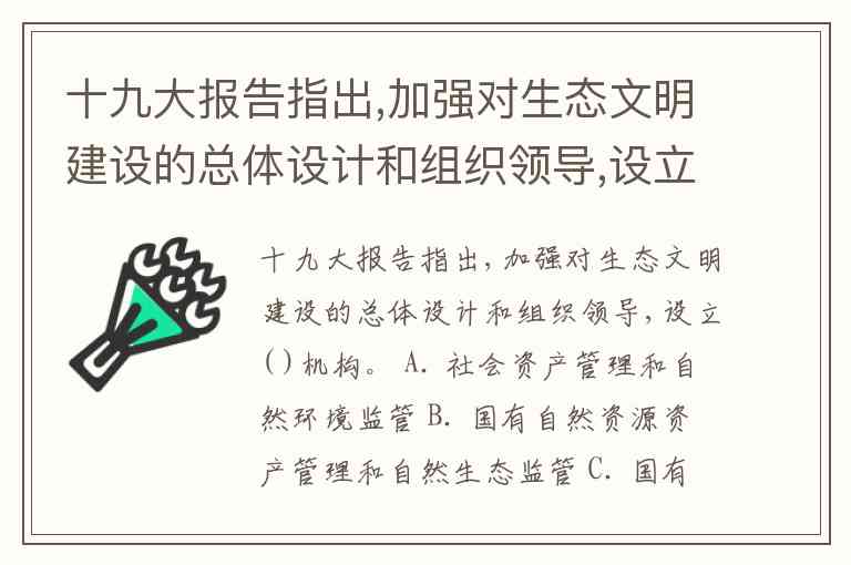 十九大报告指出,加强对生态文明建设的总体设计和组织领导,设立( )机构。 A. 社会资产管理和自然环境监管 B. 国有自然资源资产管理和自然生态监管 C. 国有自然资源资产经营和自然生态管理 D. 国有自然环境资产监管和自然生态管理