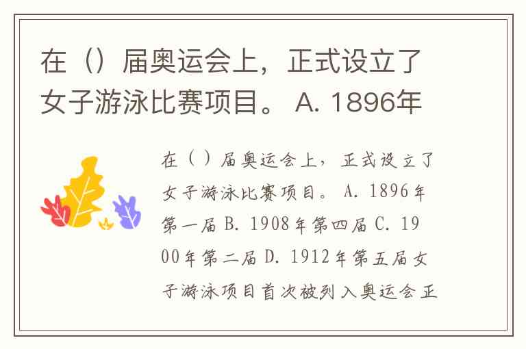 在()届奥运会上,正式设立了女子游泳比赛项目。 A. 1896年第一届 B. 1908年第四届 C. 1900年第二届 D. 1912年第五届