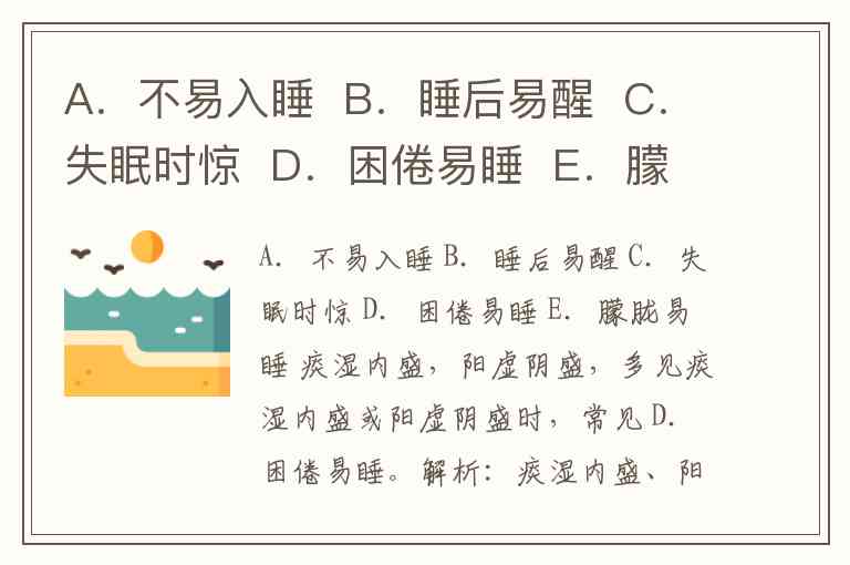 A.不易入睡 B.睡后易醒 C.失眠时惊 D.困倦易睡 E.朦胧易睡 痰湿内盛,阳虚阴盛,多见