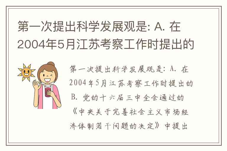 A. 在2004年5月江苏考察工作时提出的:这是错误选项。2004年5月胡锦涛同志的江苏考察讲话,是对科学发展观的进一步阐述和强调,而非首次提出。
