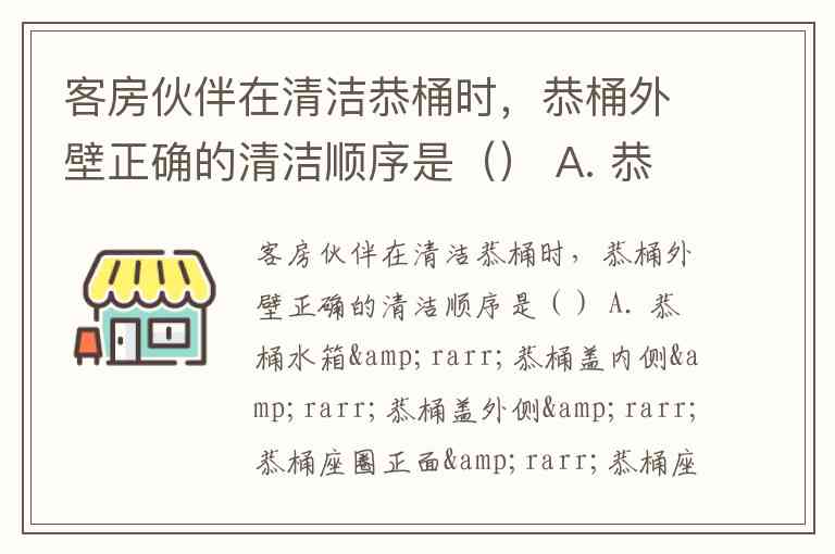 客房伙伴在清洁恭桶时,恭桶外壁正确的清洁顺序是() A. 恭桶水箱→恭桶盖内侧→恭桶盖外侧→恭桶座圈正面→恭桶座圈反面→恭桶缸沿及底座的顺序 B. 恭桶盖外侧→恭桶盖内侧→恭桶座圈正面→恭桶座圈反面→恭桶水箱→恭桶缸沿及底座的顺序 C. 恭桶座圈正面→恭桶盖内侧→恭桶盖外侧→恭桶水箱→恭桶座圈反面→恭桶缸沿及底座的顺序 D. 恭桶座圈正面→恭桶盖内侧→恭桶水箱→恭桶盖外侧→恭桶座圈反面→恭桶缸沿及底座的顺序
