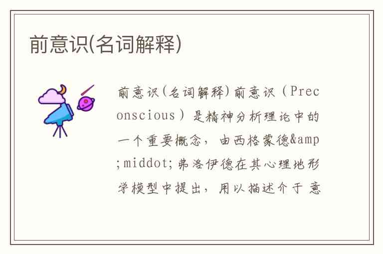 前意识(Preconscious)是精神分析理论中的一个重要概念,由西格蒙德·弗洛伊德在其心理地形学模型中提出,用以描述介于 意识和 无意识 之间的心理层面。