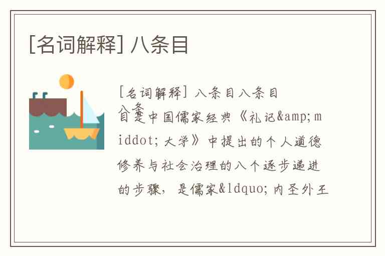 八条目是中国儒家经典《礼记·大学》中提出的个人道德修养与社会治理的八个逐步递进的步骤,是儒家“内圣外王”思想的具体实践路径。由宋代经朱熹整理后,成为“四书”体系的核心内容之一。