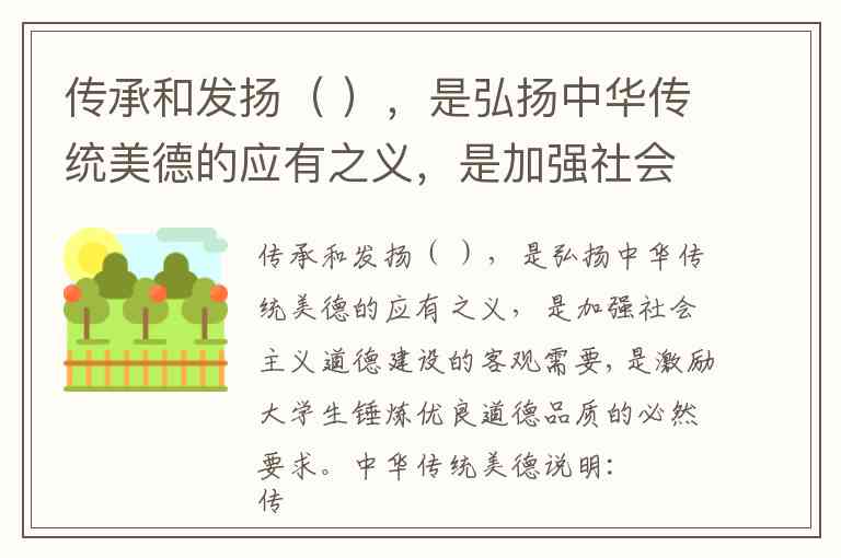 说明:传承和发扬中华传统美德,既是对中华优秀传统文化核心价值的延续,也是构建当代社会主义核心价值观的重要基础。它有助于增强文化自信,推动社会道德建设,并为大学生道德修养提供精神滋养和实践指引。