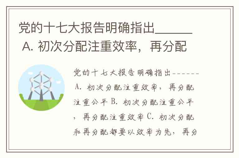 党的十七大报告明确指出______ A. 初次分配注重效率,再分配注重公平 B. 初次分配注重公平,再分配注重效率 C. 初次分配和再分配都要以效率为先,再分配更加注重效率 D. 初次分配和再分配都要处理好效率和公平的关系,再分配更加注重公平