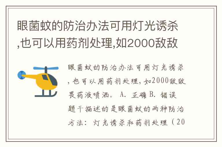 眼菌蚊的防治办法可用灯光诱杀,也可以用药剂处理,如2000敌敌畏药液喷洒。 A. 正确 B. 错误