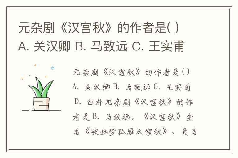元杂剧《汉宫秋》的作者是( ) A. 关汉卿 B. 马致远 C. 王实甫 D. 白朴