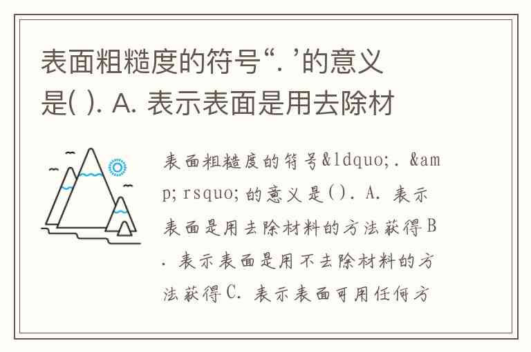 表面粗糙度的符号“. ’的意义是( ). A. 表示表面是用去除材料的方法获得 B. 表示表面是用不去除材料的方法获得 C. 表示表面可用任何方法获得; D. 用锉刀锉削后获得。