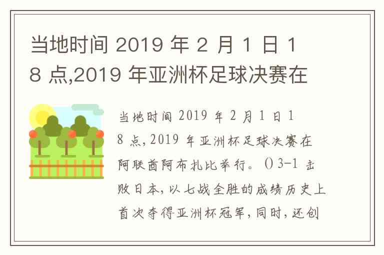 当地时间 2019 年 2 月 1 日 18 点,2019 年亚洲杯足球决赛在阿联酋阿布扎比举行。()3-1 击败日本,以七战全胜的成绩历史上首次夺得亚洲杯冠军,同时,还创造了连续 609 分钟不失球的单届亚洲杯纪录。 A. 卡塔尔 B. 韩国 C. 澳大利亚 D. 中国