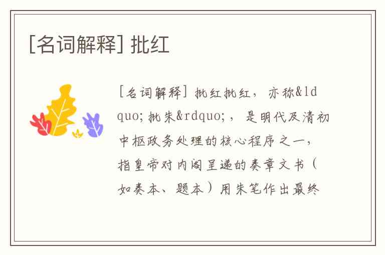 批红,亦称“批朱”,是明代及清初中枢政务处理的核心程序之一,指皇帝对内阁呈递的奏章文书(如奏本、题本)用朱笔作出最终裁定批示的制度。