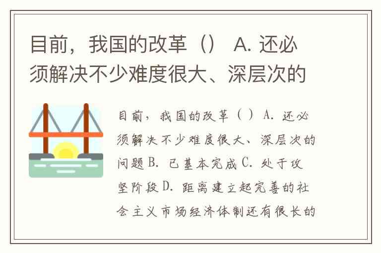 目前,我国的改革() A. 还必须解决不少难度很大、深层次的问题 B. 已基本完成 C. 处于攻坚阶段 D. 距离建立起完善的社会主义市场经济体制还有很长的路程