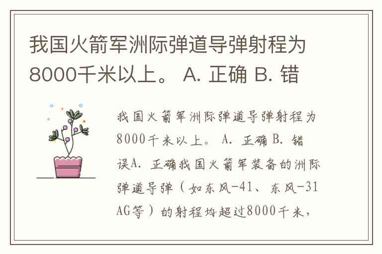 我国火箭军洲际弹道导弹射程为8000千米以上。 A. 正确 B. 错误