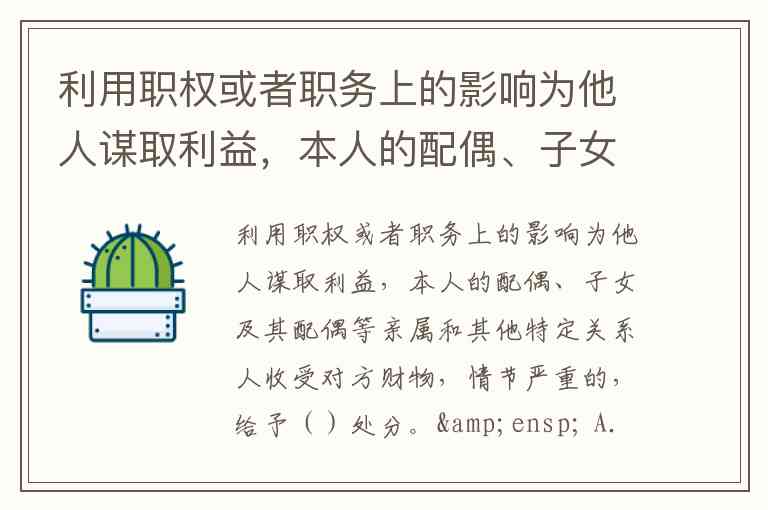 利用职权或者职务上的影响为他人谋取利益,本人的配偶、子女及其配偶等亲属和其他特定关系人收受对方财物,情节严重的,给予()处分。 A. 严重警告 B. 撤销党内职务 C. 留党察看 D. 开除党籍
