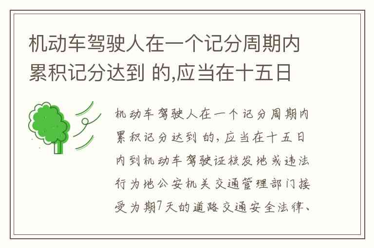 根据《机动车驾驶证申领和使用规定》,机动车驾驶人在一个记分周期内累积记分达到 12分 的,公安机关交通管理部门应当扣留其机动车驾驶证,驾驶人应当在十五日内到机动车驾驶证核发地或者违法行为地公安机关交通管理部门参加为期七日的道路交通安全法律、法规和相关知识学习,并参加考试。