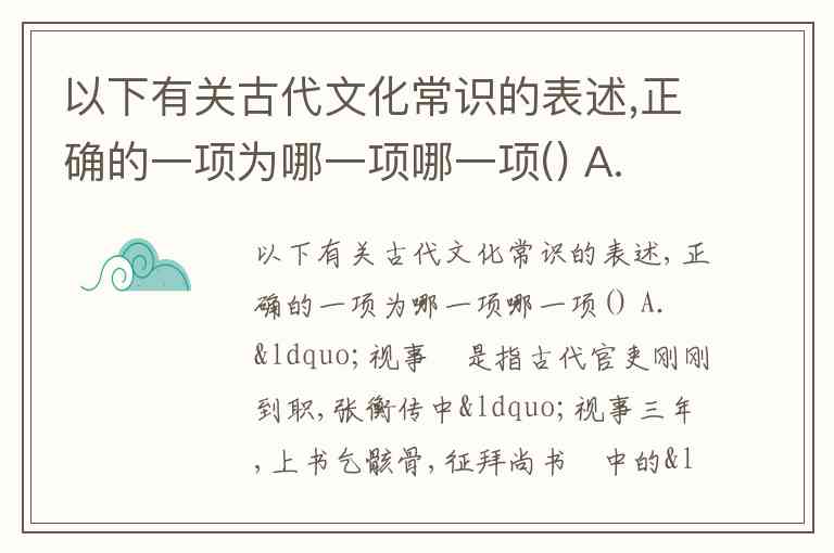 以下有关古代文化常识的表述,正确的一项为哪一项哪一项() A. “视事〞是指古代官吏刚刚到职,张衡传中“视事三年,上书乞骸骨,征拜尚书〞中的“视事〞一词就是此意。 B. “进士〞,是古代科举殿试及第者之称,意为可以进授爵位之人。唐朝时以进士和明经两科最为主要,元、明、清时,贡士经殿试后,及第者皆赐出身,称进士。 C. 刍荛,割草打柴的人,指代乡野间见闻不多无知浅陋的人或者普通百姓。常用“刍荛之见〞来批评别人见识短浅。 D. “字〞是古人入学时取,通常和名有意义上的联络,也便于别人称呼。对平辈或者尊辈称字出于礼貌和尊敬。