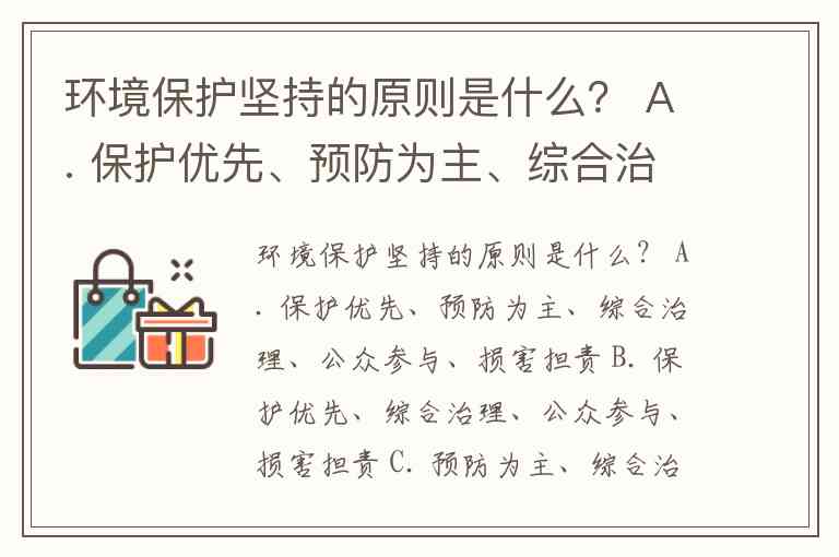 环境保护坚持的原则是什么? A. 保护优先、预防为主、综合治理、公众参与、损害担责 B. 保护优先、综合治理、公众参与、损害担责 C. 预防为主、综合治理、公众参与、损害担责 D. 保护优先、预防为主、综合治理、公众参与
