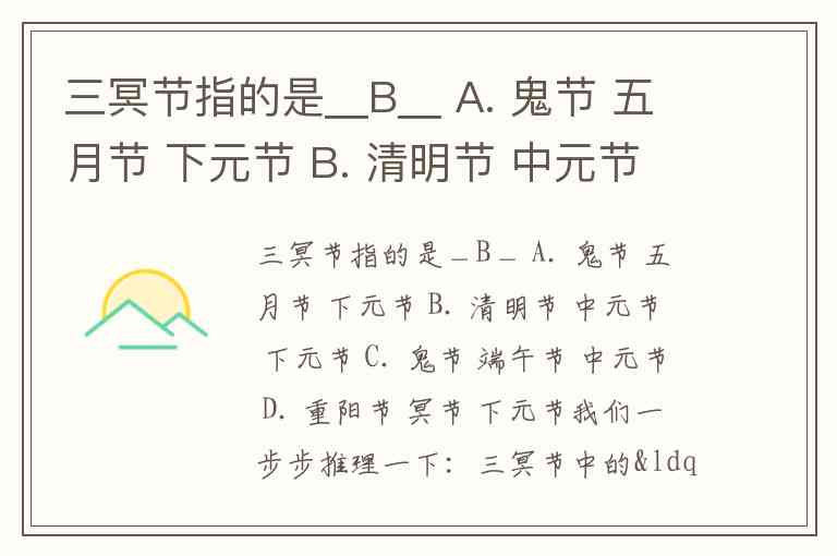 三冥节指的是_B_ A. 鬼节 五月节 下元节 B. 清明节 中元节 下元节 C. 鬼节 端午节 中元节 D. 重阳节 冥节 下元节